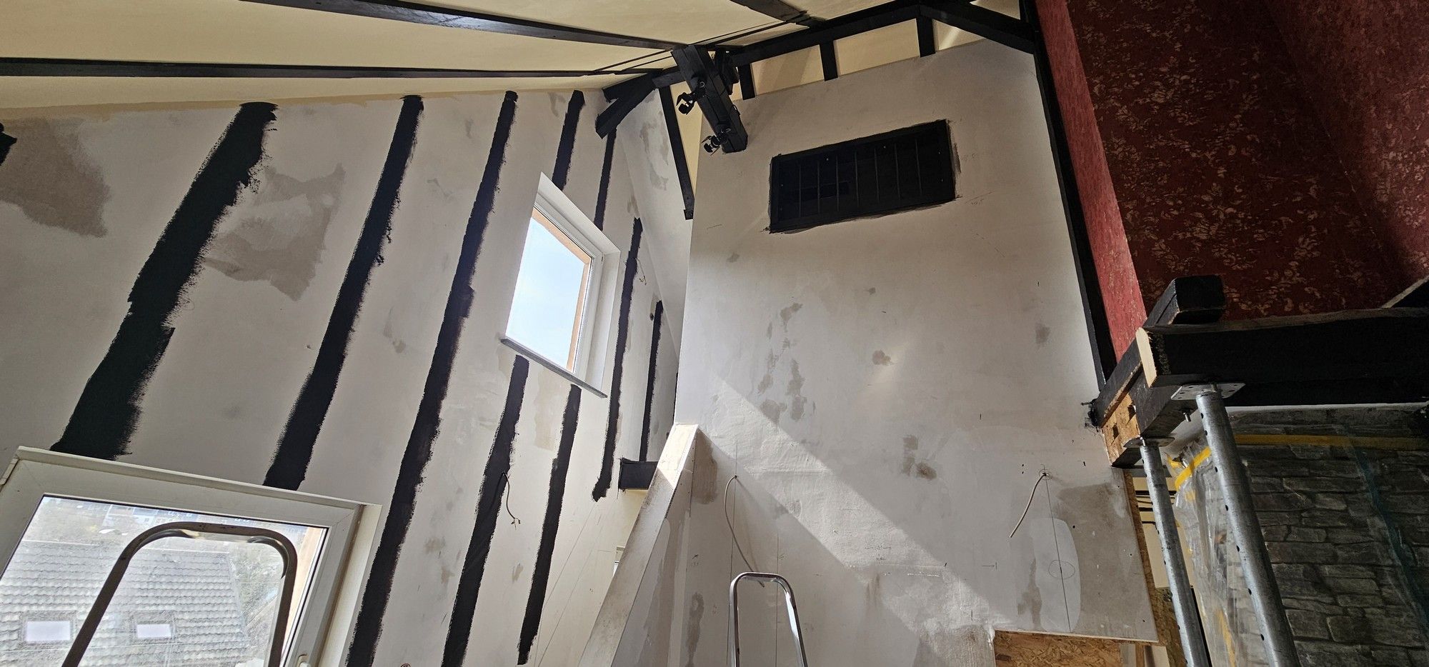 Von der Galerie aus gelangt man links durch einen großen, offenen Durchgang in einen weiteren Raum, die Filterkammer oder auch den Vorraum zum Kerker in der Art einer Zelle mit klappbarer Metallpritsche und diverse Fixierungsmöglichkeiten. Aus diesem Raum führt dann eine steile Stiege hoch zu dem eigentlichen Kerker auf dem Dachboden, aus dem kein Entkommen möglich ist. Im Kerker selbst stehen nochmal ein Fesselstuhl sowie diverse Fixierungsmöglichkeiten zur Verfügung.